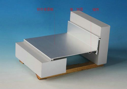金属卡锁型内墙变形缝——由一块自由移动的中心板来实现变形,中心板压紧在两侧铝合金基架之间,在建筑物发生伸缩变形时能保持其水平状态。