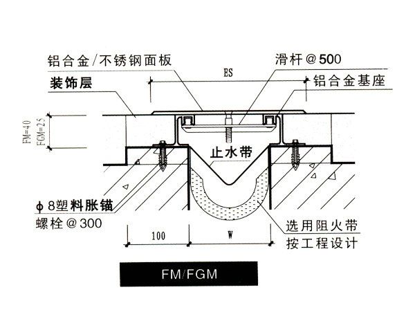 金属盖板型地坪变形缝——增加盖板厚度,提高承载能力,采用滑杆确保变形缝装置变位时仍能保持中心及原有位置。